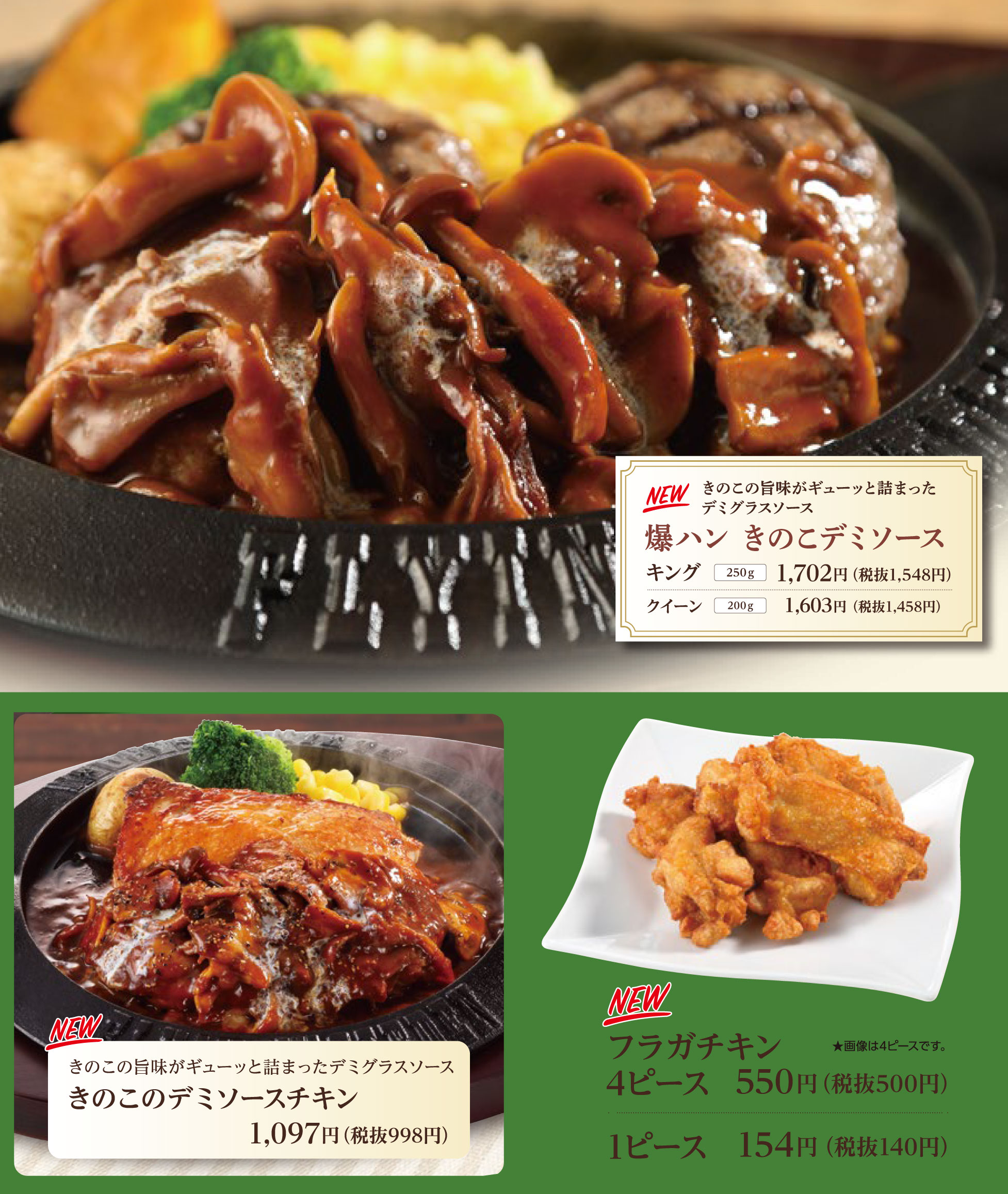爆弾ハンバーグに新ソースの「爆ハン・きのこデミソース」が登場しました。