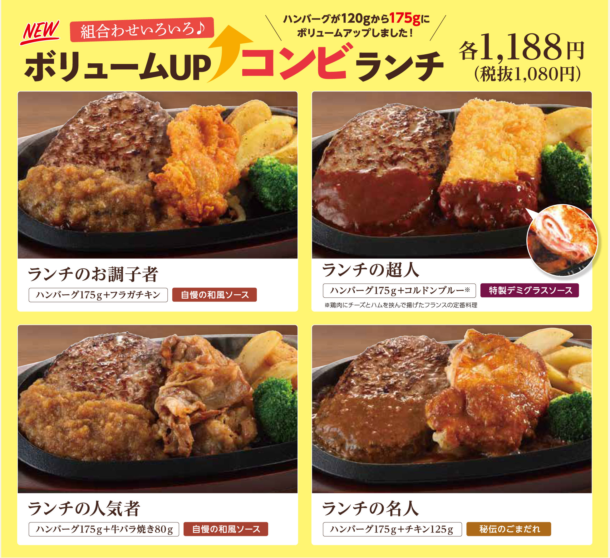 また、ランチの限定商品として、ハンバーグと組合せたお得なコンビランチ4品が登場。フライングガーデンの新しいメニューをご堪能ください。