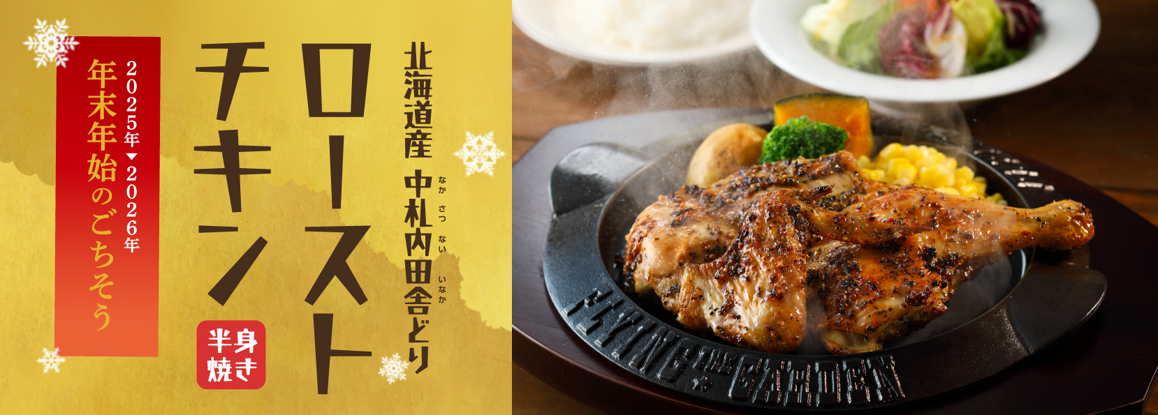 2025年12月23日(火)よりフライングガーデン店舗(※柏の葉店は除く)で、期間・数量限定「ローストチキン(半身焼き)」メニューを販売いたします。