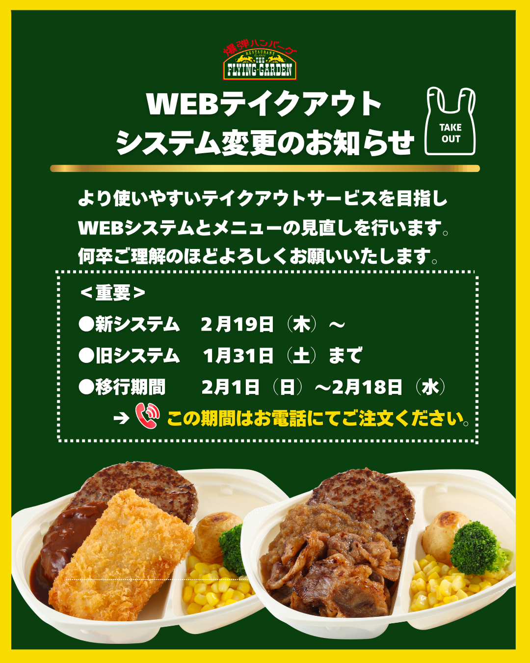 ⇒テイクアウトのご注文は「お電話のみ」